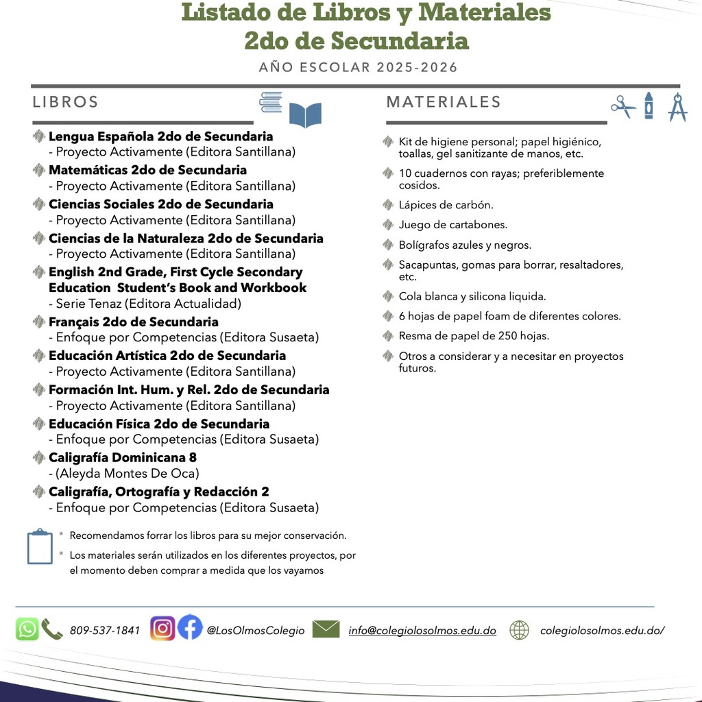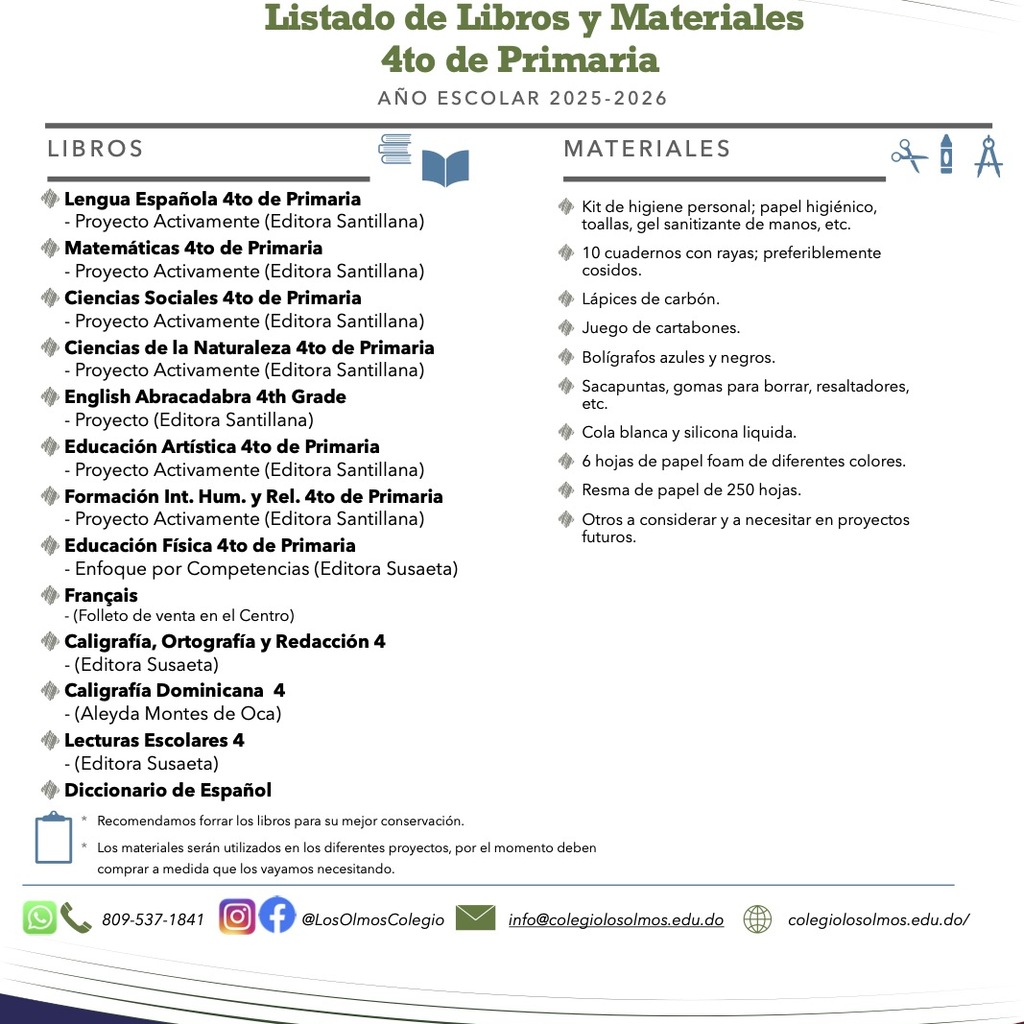 Adjunto los listados de libros y materiales para el próximo Año Escolar 2025-2026, iniciando desde Párvulos (2 años) hasta 6to de Secundaria.