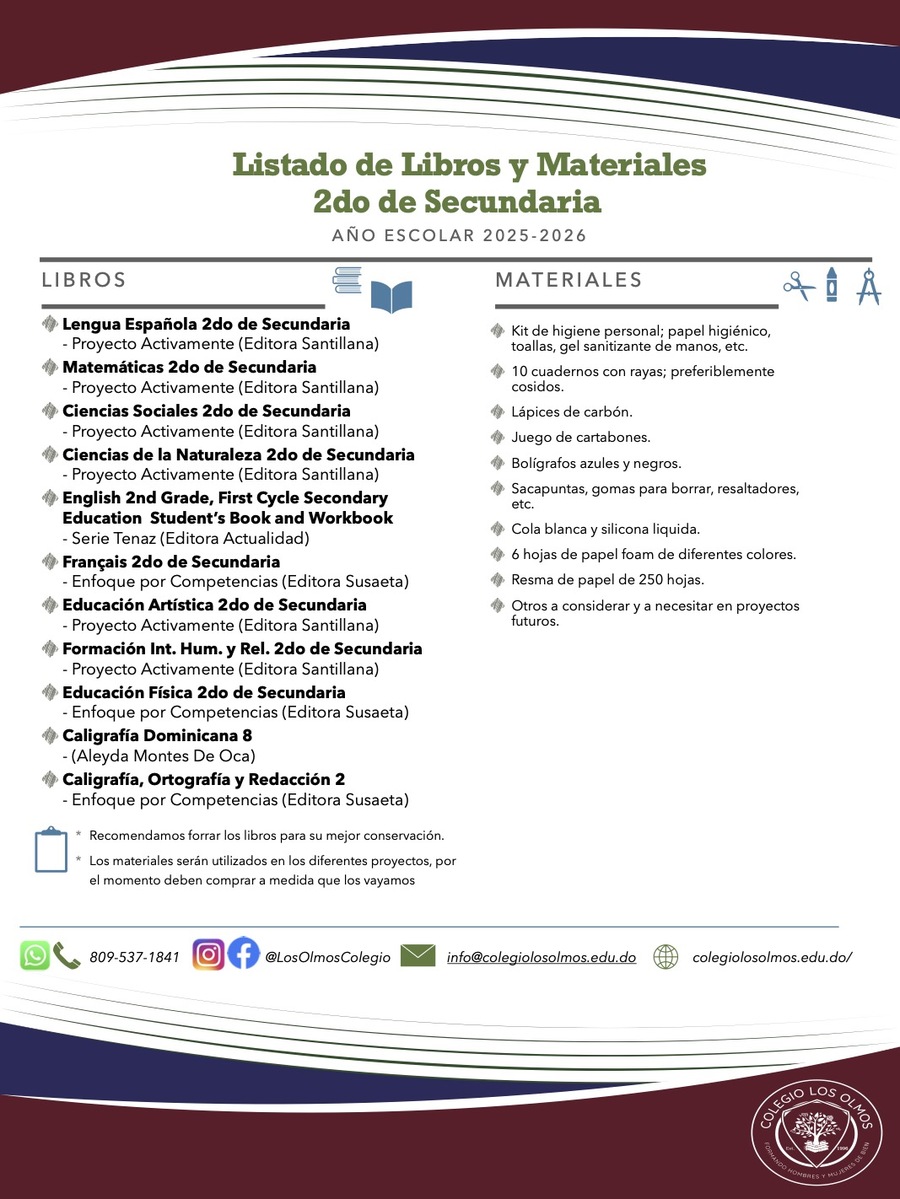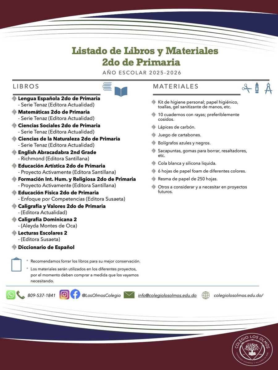 Adjunto los listados de libros y materiales para el próximo Año Escolar 2025-2026, iniciando desde Párvulos (2 años) hasta 6to de Secundaria.